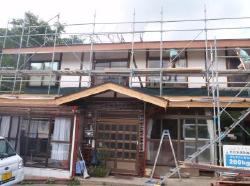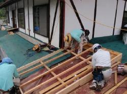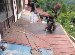 | 7月に入りいよいよ着工です。1階部分の屋根を剥ぎ取り、葺き替えです。 それまでに荷物の整理をだいぶしておいて頂きました。 |