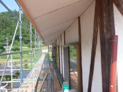 いよいよ足場を組み作業本格工事の開始です。 破風板の張り替え、屋根のタレ下がりを直しながらの作業です。 |
