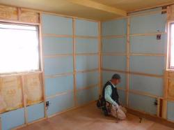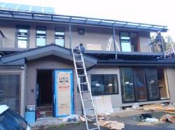 | 土壁の残る壁にはスタイロホームの断熱材を入れます。 | 外壁サイディング工事開始です。 | 外回りもあと一息と言うところまできました。 |