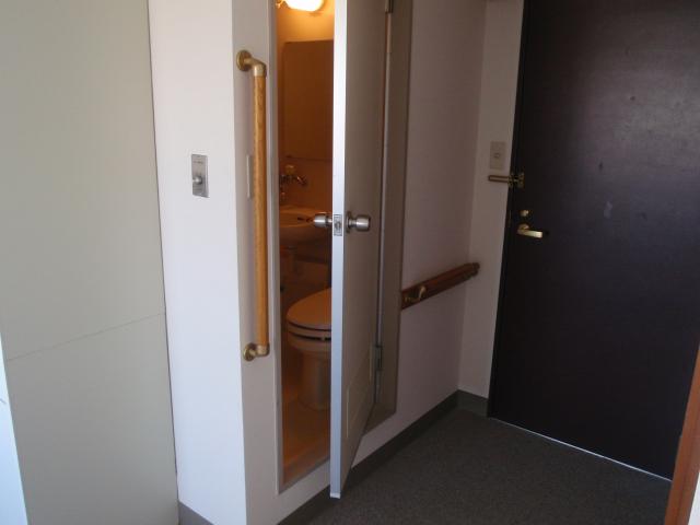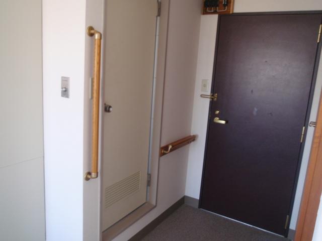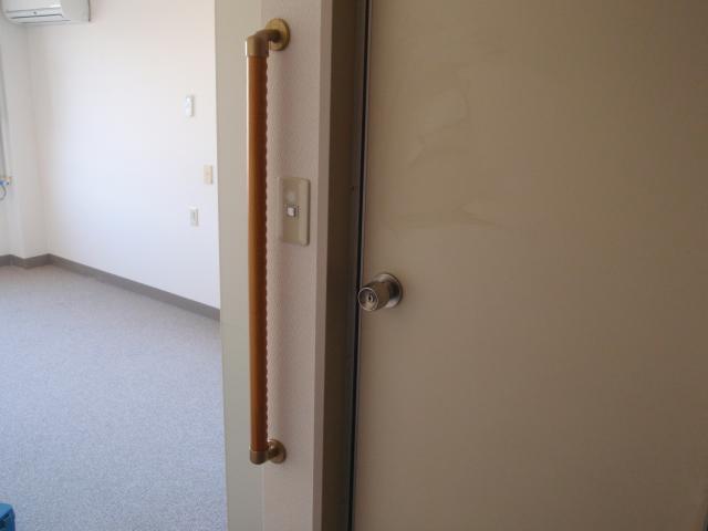 | ユニットバスの入口には、縦型の手摺りを取り付けました。 | 玄関戸の横の壁に、横型の手摺りを取り付けました。 | 当初の予定通りの完成です。 |