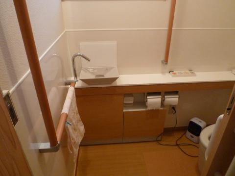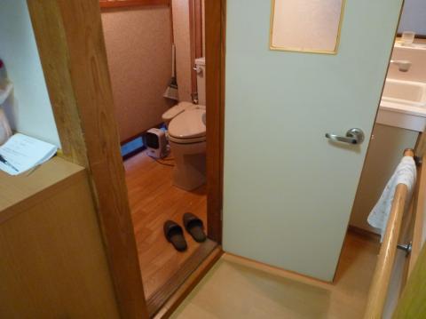 | 小便器もありますが、お父さんは足腰が弱くなり、小便の時も座って用を足しています。 | トイレの中には、手摺りがありません。 出入り口も狭くとても不自由です。 |