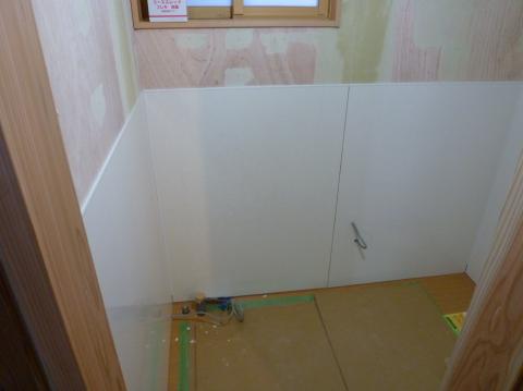 | 古い床は全部撤去、解体が終了しました。 | 跳ね上げ式手摺りをつける場所には、あらかじめ下地を入れておきます。 | トイレの腰壁は、大建プレミアートを使用。 おしっこが飛び散っても吸い込まず、拭くだけで綺麗になり、とっても清潔です。 |