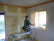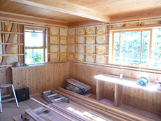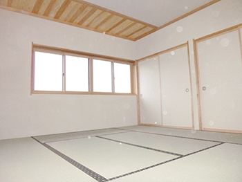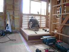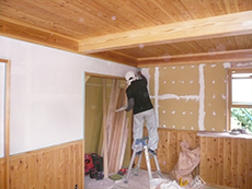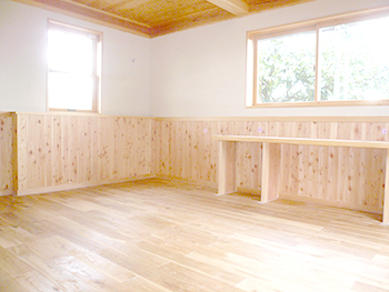 | 1階の寝室ですが、既存の梁は化粧材で包み化粧梁を新しく付けます。天井は長野県産の唐松の羽目板を使用します。 | 窓枠もしっかりと自然素材を使い丁寧に施工を行っていきます。 | 小上がりの壁は塗り壁で仕上げます。塗り壁も天然素材の材料を使用しています。 |