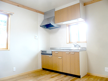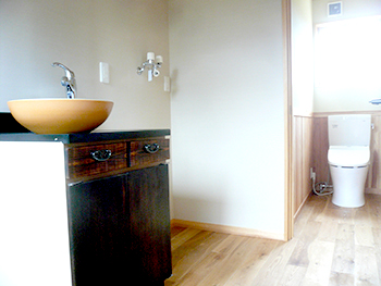 | トイレと洗面台です。洗面台はご子息のオリジナル作品です。オシャレな洗面台です。 | 収納が多くお家に良く合うブラウンのキッチンを設置いたしました。 |
