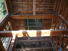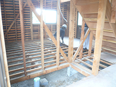 | 解体作業中です。主要の構造材を残し、ほぼ撤去です。間取りが変わるので、大掛かりな解体工事です。 | 2階も天井と床、内壁を全て解体してしまいます。柱と梁と屋根が残っているだけで、殆ど解体してしまいました。 | リビングの小上がりになる場所です。柱を抜いたので、梁補強をします。梁材も材木屋に無理を言って唐松材を用意しました。 |