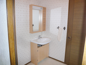 | 洗面化粧台の設置が完了です。コンパクトタイプのTOTOモデアシリーズです。壁紙とマッチしていてオシャレです。 |