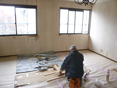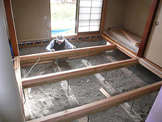| 足場を設けて施工開始です。 | 和室だったところを解体しました。砂利が敷き詰めてありました。 | ユニットバスの配管をしています。丁寧にしっかりと施工を行います。 |