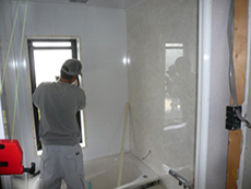 | 職人に造作をしていってもらいます。根太を入れるためにノミで溝を造ります。 | 窓枠を造ってもらっています。一つ一つ丁寧に作業を行っていきます。 | 天井もしっかり固定し、鏡、シャワー、カランも設置完了です。 |