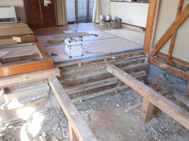 | 新しく2階の屋根が葺き終わりました。1階の瓦は差し替えて、軒先の瓦は一度剥いで新しくゴムアスルーフィングを敷いて瓦を復旧します。 | 耐震補強を兼ねて間仕切りをする箇所に布基礎が無かったので、布基礎を増設しました。片側の床板を剥いで潜ってのさ作業です。 | 床の撤去が終わり、布基礎の連結も終わりました。床下にシロアリの被害は無さそうなので、このまま工事を進めます。 | |