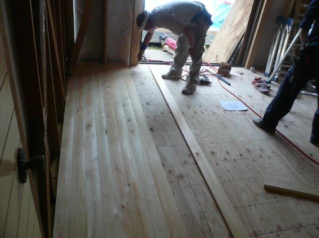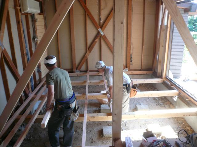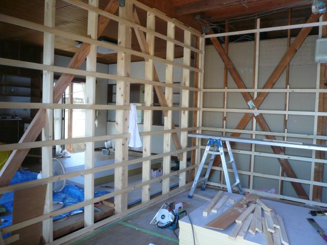 書斎の床はご主人様の希望で檜の無垢材を張ります。檜の目や色具合をみながら大工さんがフローリングを張っていきます。 | 部屋の中間仕切り組み、壁の下地を組んでいきます。古い間仕切りの筋交いも、補強金物を設置出来る箇所は補強プレートを取り付けます。 | |