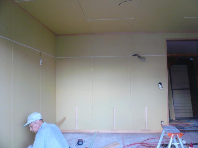 | 壁の石膏ボードがある程度張れたら、天井を張ります。断熱材をしっかりと敷き詰めて、石膏ボードを張っていきます。 | 大工工事は仕上げの段階です。床と壁の見切りの巾木を取り付けています。後は塗装とクロスを貼れば完成です。 | 屋根の瓦工事が終わったので、軒天を張り替えます。今回は下地も組み直します。 | |