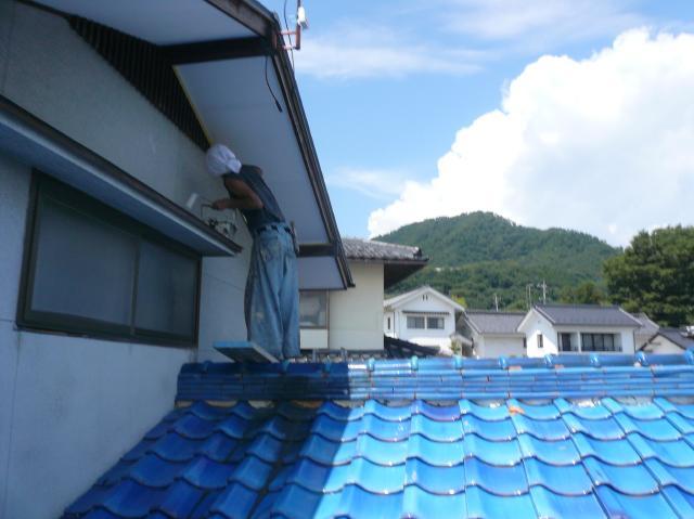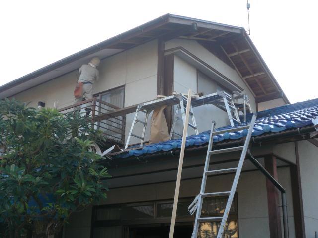 | 二手に分かれて、軒天を張り替えます。全面張替えになりますので、結構手間がかかります。 | 軒天が張終わったので、見切りと軒天の塗装工事です。 | 手すりの塗装も終わったので、ベランダのデッキを張り替えます。これで工事は完了になります。 |