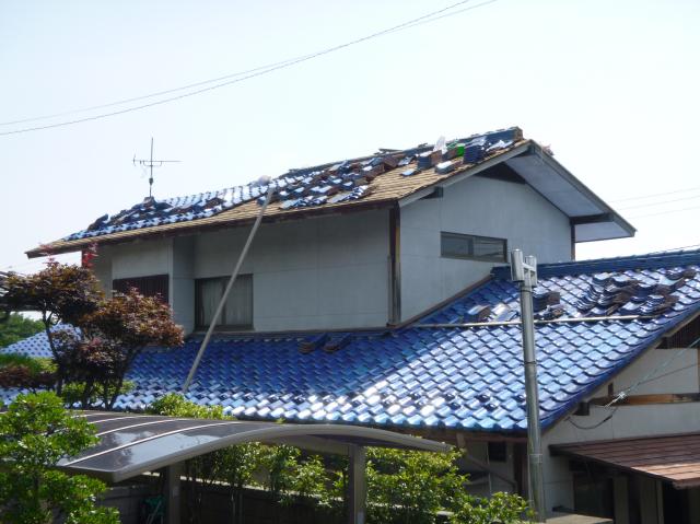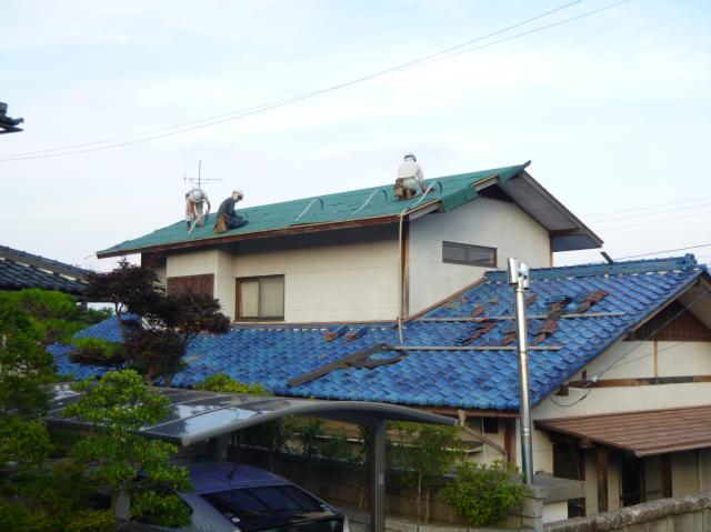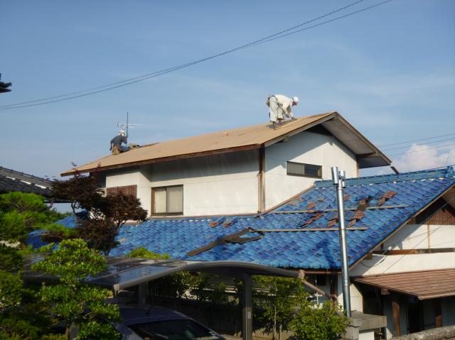 | 先ずは2階の屋根の瓦を剥いで、屋根の下地を出します。撤去した瓦は1階の屋根の差し替えに使用します。 | 板金で葺き替えるのですが、既存の下地の上に12mmの合板を張り屋根の下地を作り直します。 |