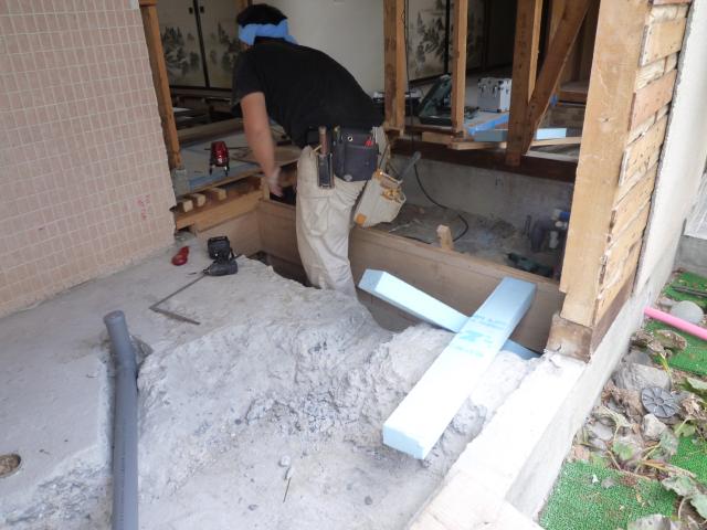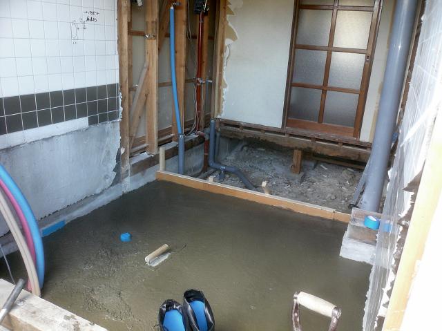 | フローリングになる部屋には断熱材をしっかり入れます。 | 造作工事です。 | ユニットバスにするために間取りを変更し、土間コンクリートを打ちます。 |