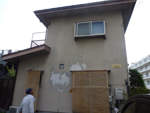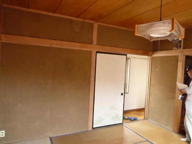 | 暫くだれも住んでいなかったようで、傷みが激しいです。屋根も外壁も塗装替えです。 | かつてはこのような浴室が普通でした。もちろんユニットバスにリフォームです。 | 廊下の壁はセンイ壁のような仕上です。この壁を直したご希望です。 |