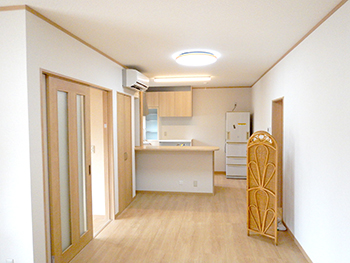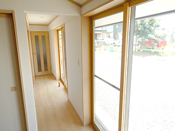 | 廊下は、大きな窓からの陽射しの差し込む気持ちの良い明るい空間になりました。サッシも木目調のものにしました。 | 部屋を繋げて広々としたLDKに生まれ変わりました。家族団らんの時間をゆったり過ごすことができますね。 |