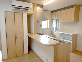 | キッチンはリビングの様子がわかるカウンタータイプです。料理を作りながらも家族とコミュニケーションがとれます。 | 床と色調を合わせたウッディーなシステムキッチンです。床や柱にお色を合わせたものを提案させていただきました。 |