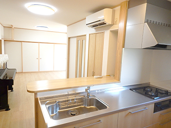 お風呂とキッチンは、お手入れのしやすいTOTOのシステムバスとキッチンをご提案し設置させていただきました。また、本宅と別宅が離れていた問題に関しては、別れていた部屋をつなげて、一つの大きなLDKへと施工しました。玄関の上がり口がなかったので新しく作り、別棟とつなげる渡り廊下も作りました。 |