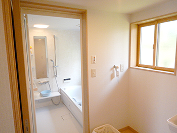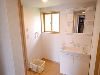 | 洗面化粧台の施工後です。しっかり収納できるスペースが増えたので様々な物を使いやすい場所に保管することが可能です。 | 浴室の洗い場は出入りがし易いよう広めに空間をとりました。また広くなりつつもお手入れのしやすいタイプの浴槽を設置しました。 |