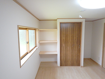 | 自然素材にこだわり、明るい空間がとても素敵な家です。棚を設置したのでちょっとした見せる収納としても活用できます。 |