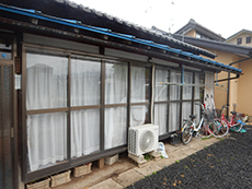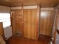 | 施工前の家の全体像です。築50年なだけあって年季がはいっています。 | お家に近づいて見ると外壁の汚れが目に入ります。 | 棚や天井が古く傷んでいました。収納スペースが足りず、物を置く場所に困っていました。 |