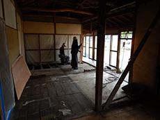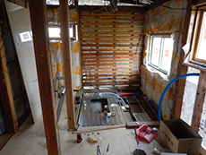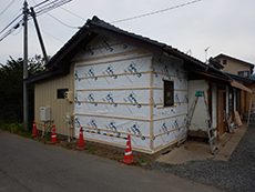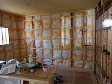 | 施工が始まりました。部屋同士をつなげるため、一度壁を壊していきます。 | 床を剥がした後の状態です。さっぱりした状態になりました。 | 断熱材を壁に貼り付けていきます。室温を一定に保つ効果が期待されます。 |
