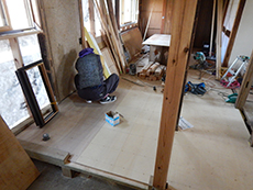 | 外から見た様子です。壁が無事貼り終わりました。 | 窓側部分も丁寧に貼り替え、施工します。 | 床部分が貼り終わりました。フローリングを敷く前の状態です。 |