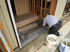 | 給水・給湯・排水工事・電気工事と、土間工事を行いました。 | 内装の工事を進めていきます。職人の技が光りますね。 | 玄関タイルも職人の手作業で1枚1枚貼り付けました。 |