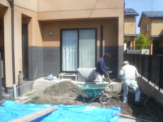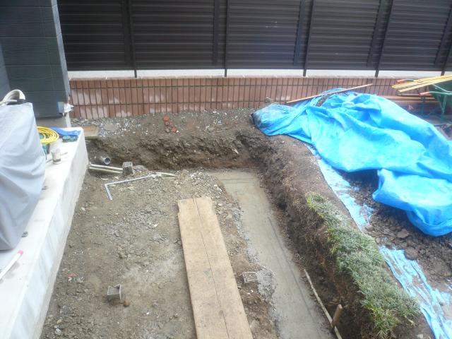 手掘りの作業は一日掛かりました。砕石を転圧して、捨てコンを打設します。 |