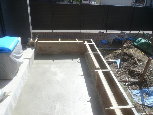 | 耐圧盤コンクリートの養生が終わり、立ち上がりの型枠を組みます。 |