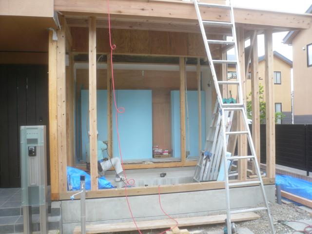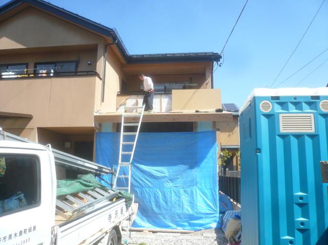 | 予め刻んでおいた材木で、増築部分の建前をします。野地板まで張りシートで雨養生をしておきます。 | 既存の柱は撤去して、新規に8寸の梁を架け補強します。追って電気屋さんも配線工事を終わらせます。 | 床組をしておきます、既存の建物が高気密高断熱の仕様なので、断熱材もスタイロエース3種の65 mm厚を使います。 |
