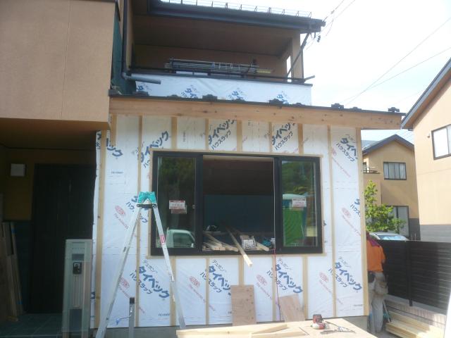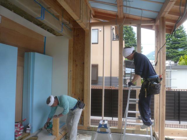 | 外壁は全面構造用合板を張り、サイディングの下地をします。 |