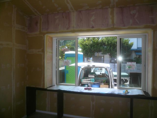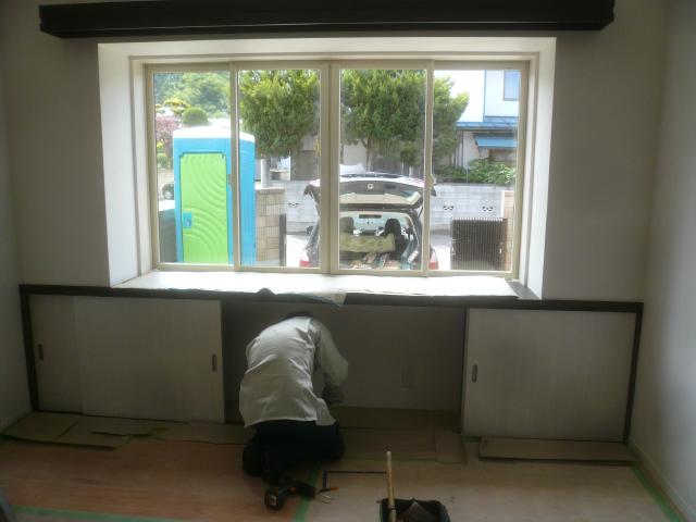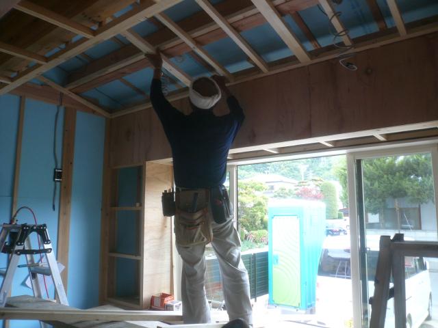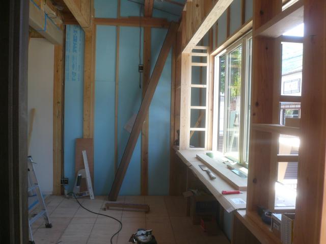 内部の造作になります、天井の下地を組みボードを張っていきます。 | 窓下はカウンターを取り付け、下部は収納になっています。 |