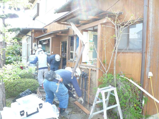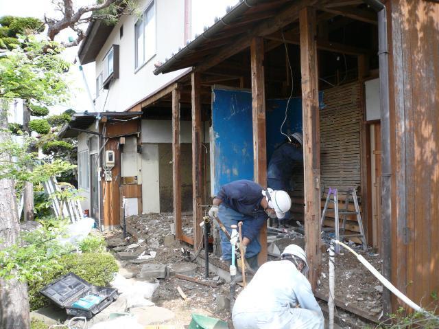 | 解体工事です。先ずは外壁から壊し、搬出しやすいように段取りしていきます。 | 台所と浴室、脱衣室を解体しているところです。浴室は土台、柱はほぼ腐っています。 | 土台・柱を入れ替える為にサポートで建物を支え、順次柱と土台を入れ替えていきます。 |
