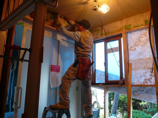 | 古い柱は一部が腐食していたりしたので、外壁面は入れ替えてしまいました。 | キッチンになる部分の床の下地です。大工さんが隙間無く断熱材を敷き込みベニヤを張っていきます。 | ユニットバスの組み立てです。初めに床をセットして水平を決めていきます。写真は洗い場の部分です。 |