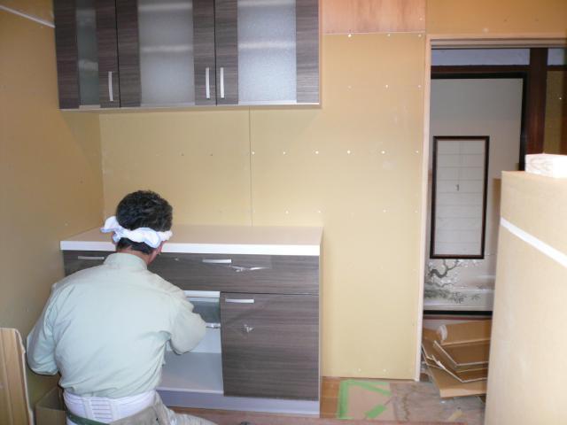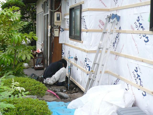 | 外部では水道や排水を接続する為、職人さんが配管をしています。 | キッチンの収納家具を組み立てています。 この後はキッチン本体を組み立てていきます。 |