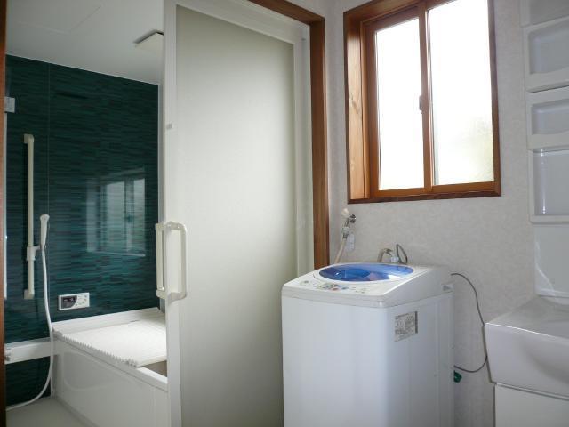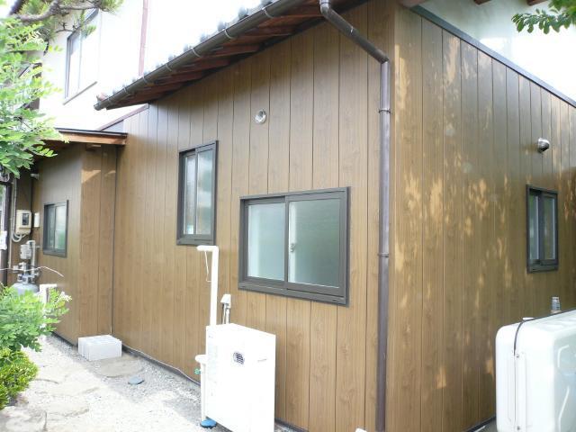 | 脱衣場からユニットバスを見たところです。脱衣室は白系統の壁紙で、窓は小さいですが実際はかなり明るいです。 | システムキッチンです。面材は木目調の暗めの色ですが、天井と壁は白系統なのですっきりと見えます。 | 増築部分の外壁は、木目の鉄板サイディングを張り、給湯器を設置して終わりです。 |