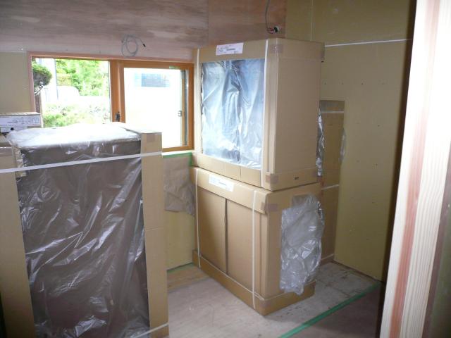 | ユニットバスが組み終わったら、大工さんが脱衣室の造作をしていきます。天井を張っているところです。 | キッチンです。キッチンを組み立てする前は、何もない空間です。 | キッチンの材料の搬入です。荷物で部屋がいっぱいになる位ですが、こうやって現場に搬入されます。 |