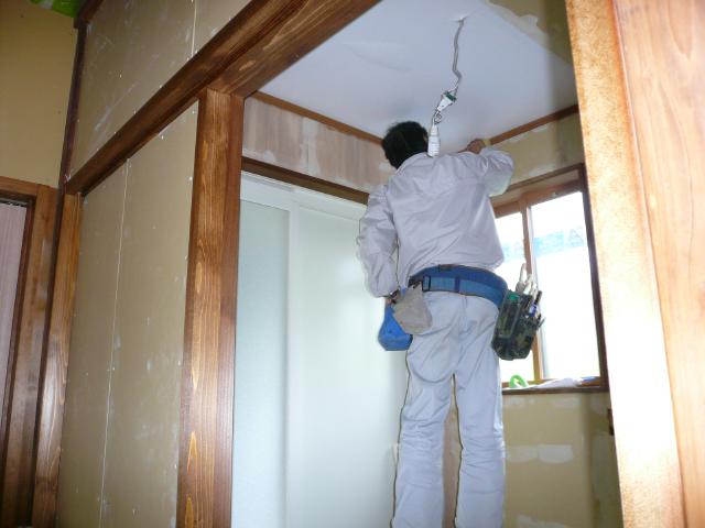 内装工事で天井のクロスを貼っていきます。ユニットバスだけは使えるように成っています。 |
