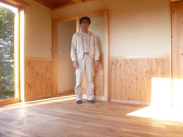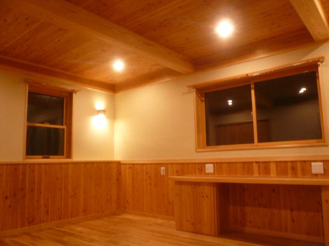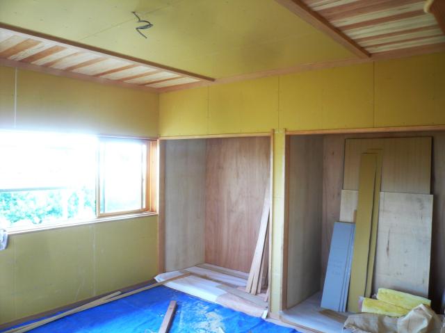 | リビングの小上がりになる場所です。柱を抜いたので、梁補強をします。梁材も材木屋に無理を言って唐松材を用意しました。 | 寝室ですが壁のボード以外は、天然素材を使用しています。腰も板張りにしたのですが唐松の羽目板です。塗装も天然オイルふきです。 | 2階の和室ですが、天井は布クロスと杉板の張り分けにしています。壁の仕上げもボードの上の仕上げは塗り壁で仕上げます。 |