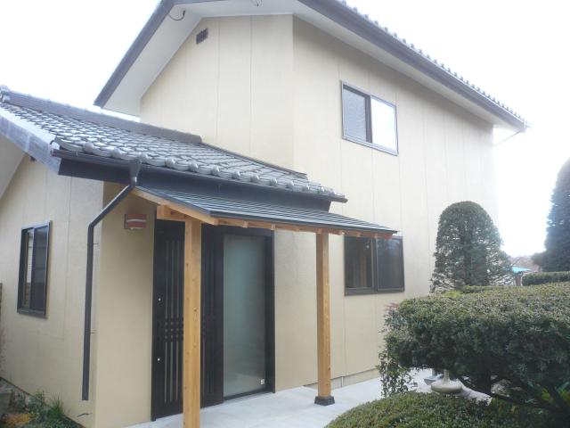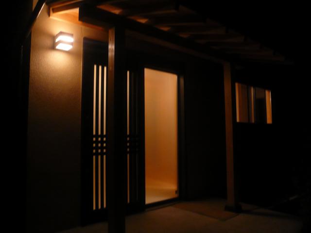 | 完成です。新しい証明を付け、庇も新たに造りました。しっかりと板金施工をしてあります。塗装もきれいに塗れています。 | 夜になるとこんな感じの証明になります。 | 二階の和室は大壁で作られ、珪藻土の壁で仕上げてあります。アクセントで裾張りをしてみました。 |