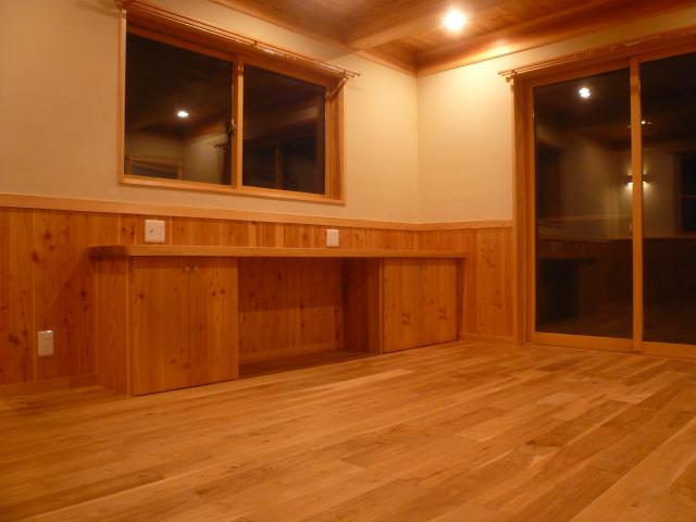 | リビングダイニングです。小上がりでご子息とゆっくりとお酒を飲んだり、お孫さんと遊ぶ様です。 | 1階の寝室です。床もナラの無垢フローリングです。カウンターでは本を読んだり、趣味の絵を描いたりできるように広く造ってあります。 | トイレと洗面台です。洗面台はご子息のオリジナル作品です。器用ですね。 |
