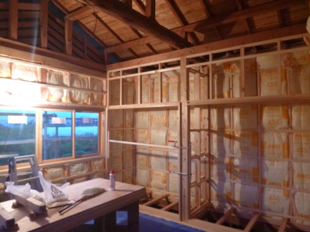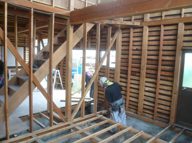 | 2階の床根太も全て入れ替えて、床の断熱材を根太の間に入れていきます。 | 元々有った筋交いですが、補強金物も無かったので新しく筋交いプレートを入れ補強します。 | 壁の下地もほぼ完成。しっかり断熱材を充填していきます。サッシも断熱サッシに入れ替えます。 |