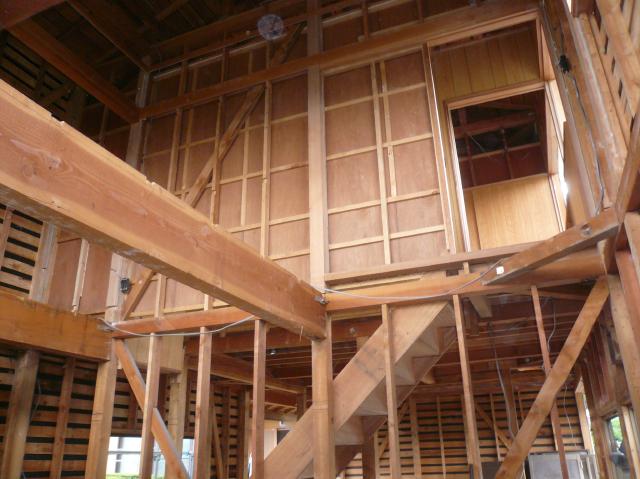 | 解体作業中です。主要の構造材を残し、ほぼ撤去です。間取りが変わるので、大掛かりな解体工事です。 | 2階も天井と床、内壁を全て解体してしまいます。 柱と梁と屋根が残っているだけで、殆ど解体してしまいました。 |