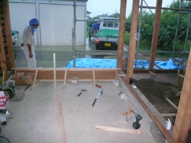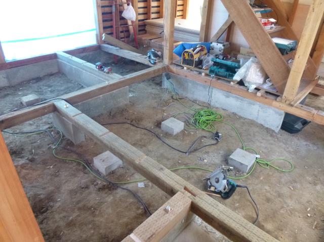 車庫だった場所はリビングになるので、布基礎を増設します。他にも間仕切りになるところにも、布基礎を増設します。 |