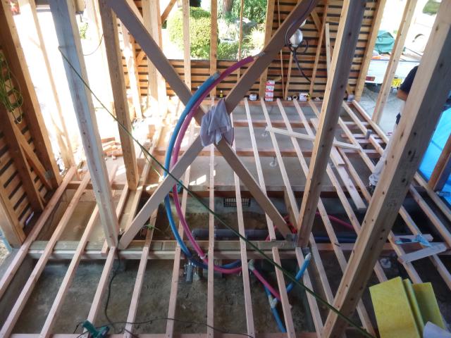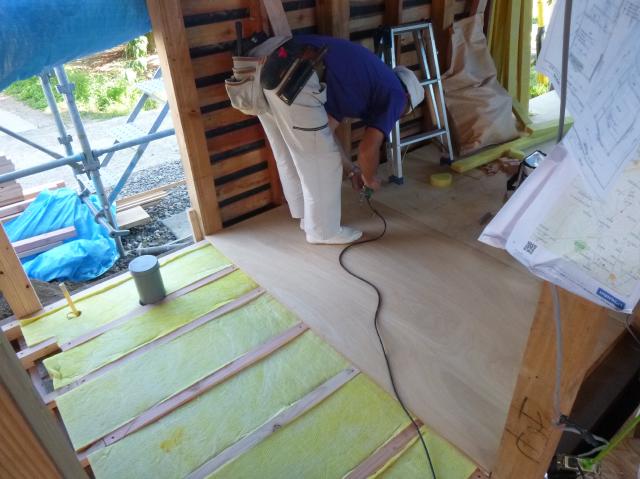 | 布基礎の上に土台を入れアンカーボルトで固定していきます。使いしも新たにセットします。 | キッチンやトイレになる箇所は、設備業者が床下配管を終わらせて床の下地を組んでいきます。 | 根太の間に床用の断熱材を入れ、床の下地合板を張っていきます。 |