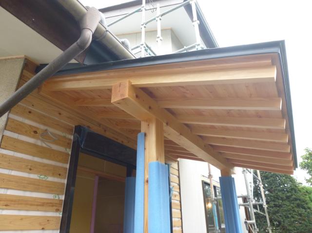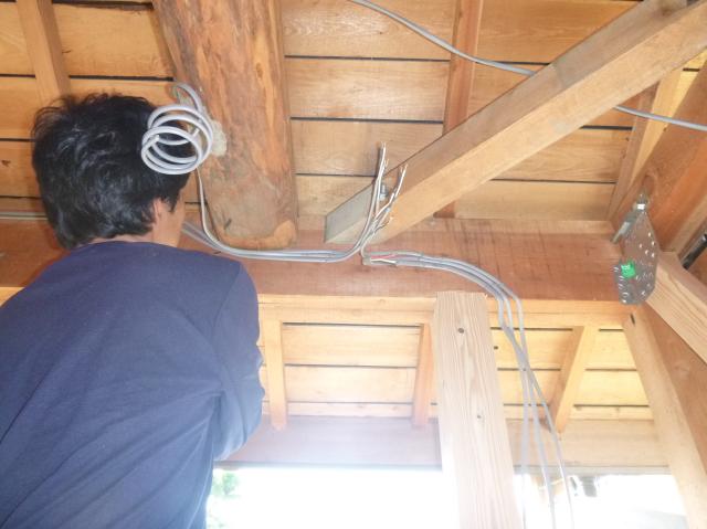 | 電気工事もほぼ新築と同じで、配線は全て新規になります。 | 1階の寝室ですが、既存の梁は化粧材で包み化粧梁を新しく付けます。天井は長野県産の唐松の羽目板を使用します。 | 玄関の庇を設けました。柱と桁と野地板は県産材の檜と唐松を使用しています。 |