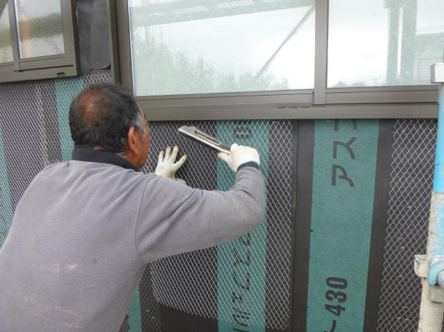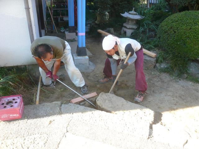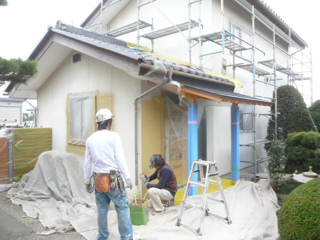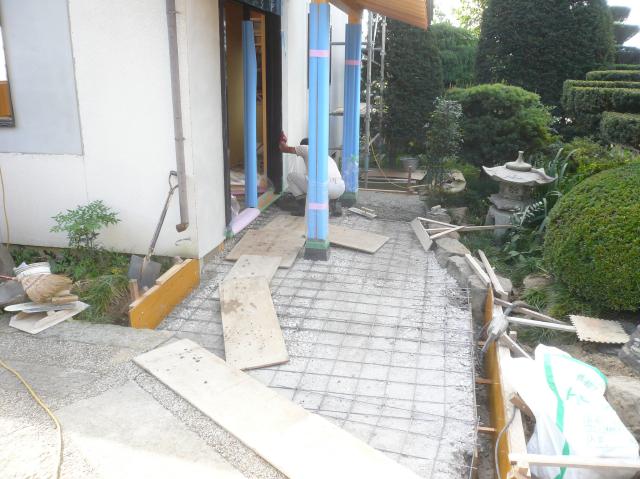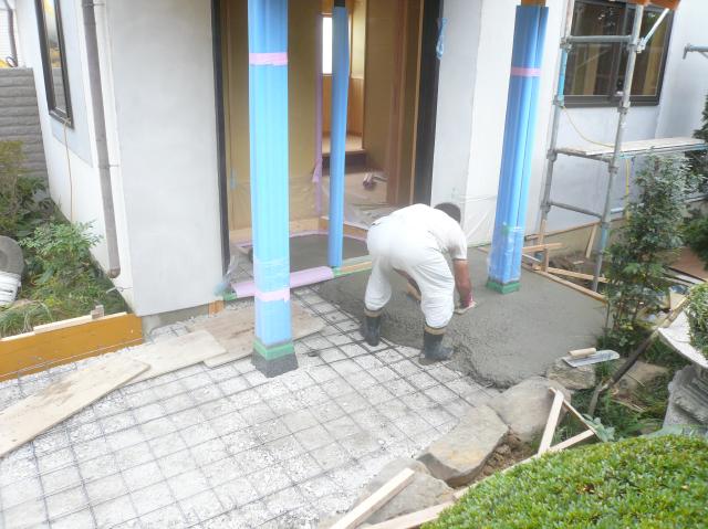 | 外廻りでは左官屋さんにモルタルを塗ってもらいます。サッシは全て入れ替えてますので部分的な補修になります。 | 下塗りが終わり、完全に乾燥させてから仕上げをかけます。 | 玄関のアプローチですが、既存の敷石を利用したりして、土間を打ちます。 |