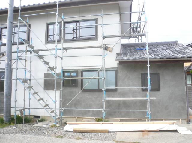 | 外部の塗装ですが、新しくモルタルで仕上げた箇所は仕上がりも違うので、既存の仕上げに合わせてリシンを吹き付けます。 | リシンが吹き終わり、乾燥させてから中塗りをします。仕上げまで入れると、塗装工事だけで4工程です。 | ローラーでシリコン塗料で仕上げていきます。リシン、アンダーフィーラー、シリコン塗料の2回塗りです。 |