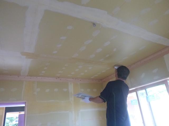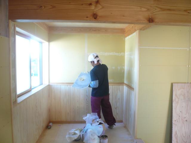 | 中では、内装工事の仕上げに入ります。ボードのジョイントやビス穴はパテで下地を作ります。 | 今回は材料にこだわり、クロスを貼る部分は全て布クロスです。ノリもでんぷん糊です。 | 天井のクロスを貼っていきます。布クロスの場合は、ビニールクロスと違い貼る手間もかかります。 |
